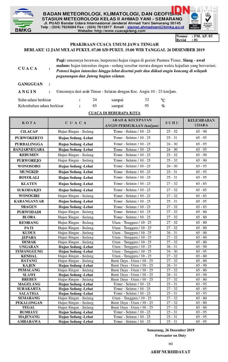Hal tersebut terlihat dari prakiraan cuaca yang dirilis Stasiun Meteorologi Kelas II Ahmad Yani, Semarang pada hari ini, Kamis (26/12).