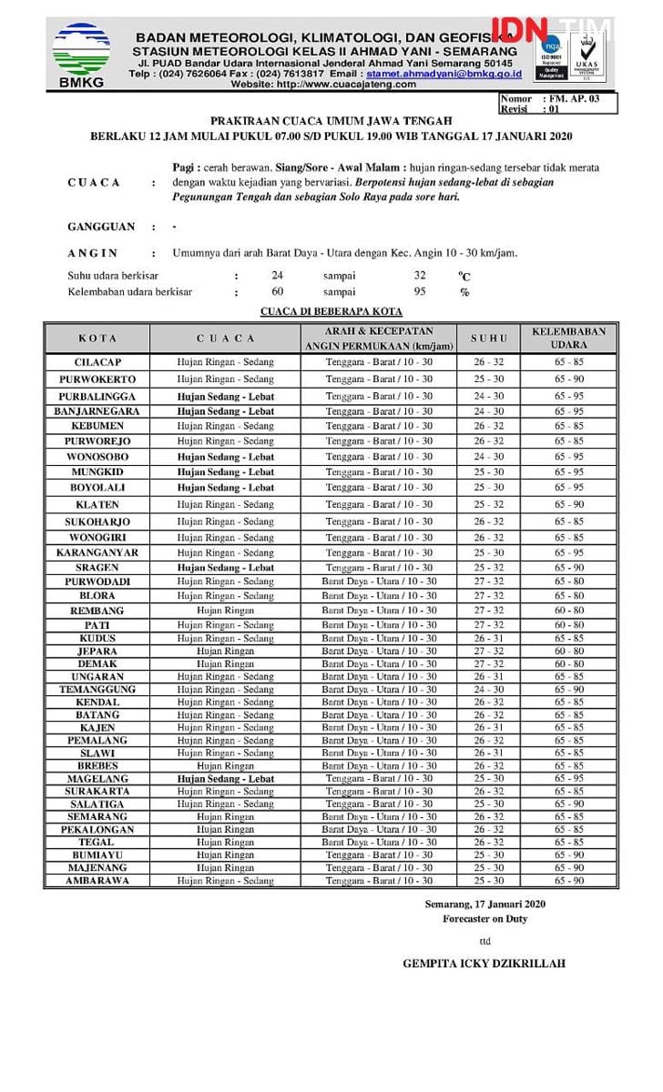 Menurut prakiraan cuaca dari Stasiun Meteorologi Kelas II Ahmad Yani Semarang, praktis hanya tujuh daerah yang dilanda hujan lebat. Daerah itu antara lain, Purbalingga, Banjarnegara, Mungkid, Boyolali, Wonosobo, Sragen dan Magelang.