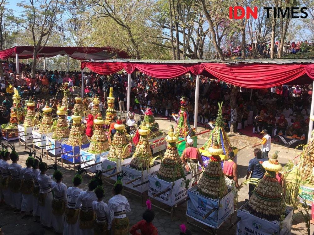 Klaten, IDN Times - Perayaan tradisi Syawalan atau Grebeg Syawal di Bukit Sidoguro, Desa Krakitan, Kecamatan Bayat, Klaten, Jawa Tengah, berlangsung meriah, Rabu (12/6). Puncak acara ditandai dengan ribuan warga yang berebut 21 gunungan ketupat atau kupat.